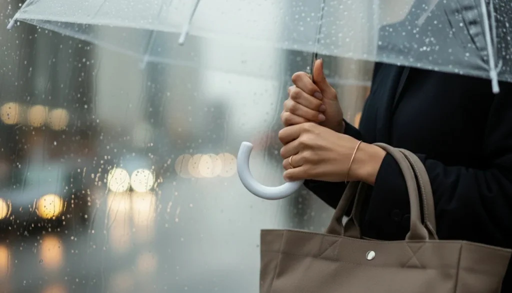 Rainy-day style lives and dies by its details. Invest in a clear or neutral-toned umbrella—it complements any outfit and photographs beautifully.