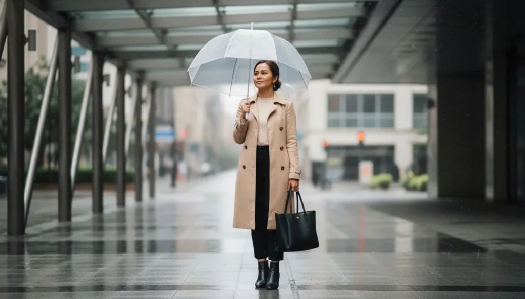 Ditch the bulky raincoat and opt for a lightweight trench in beige or taupe. Pair it with cropped tailored trousers and loafers that can handle a few splashes. Underneath, go for a breathable blouse—something that won’t cling when humidity hits.