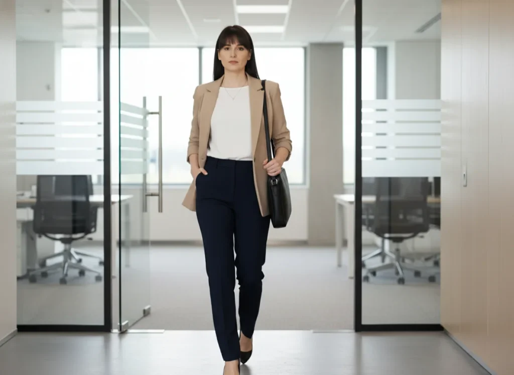 According to HR experts, adding a jacket signals authority. It frames your body and creates a “finished” look. This is perfect for client presentations or Monday morning meetings.