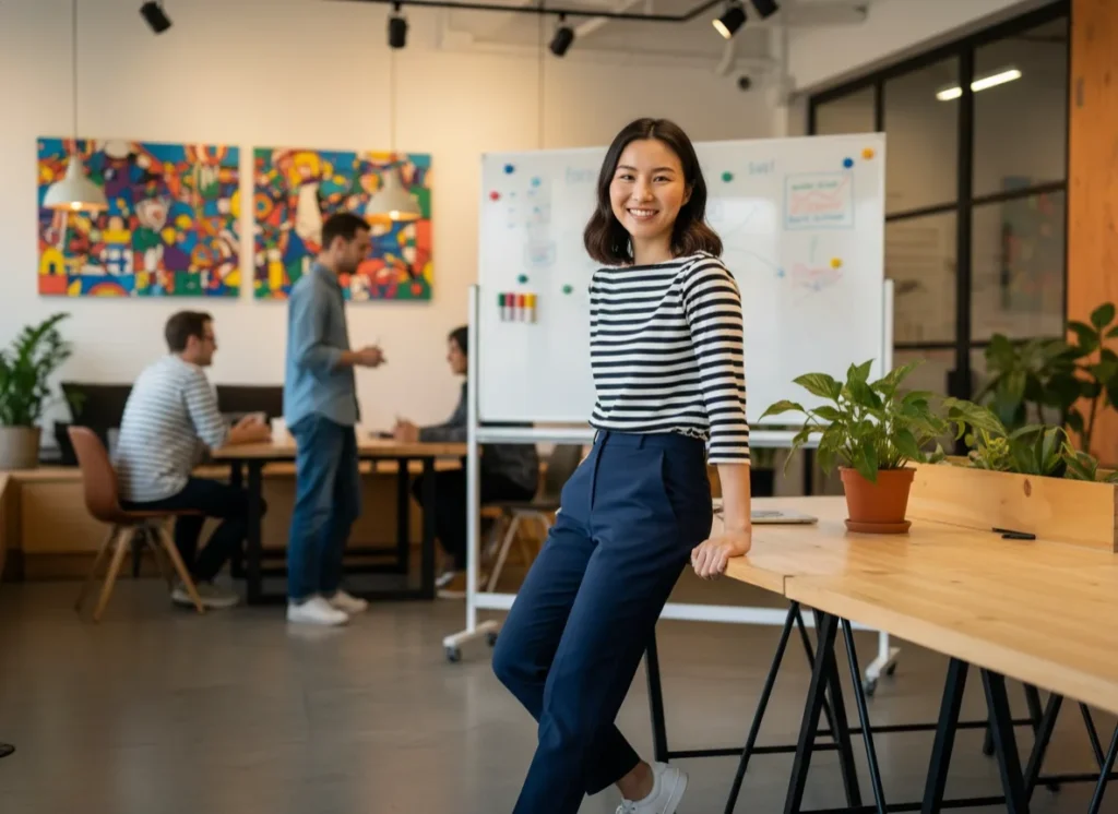 Why It Works: This is a classic “French Girl” outfit formula. The stripes add a bit of personality and fun. Pairing trousers with sneakers is modern and youthful—just make sure the sneakers are pristine white (no gym shoes!).