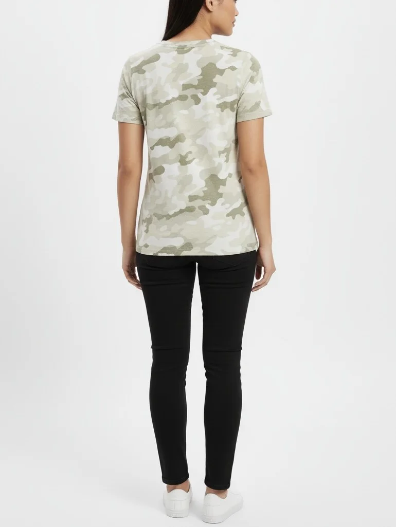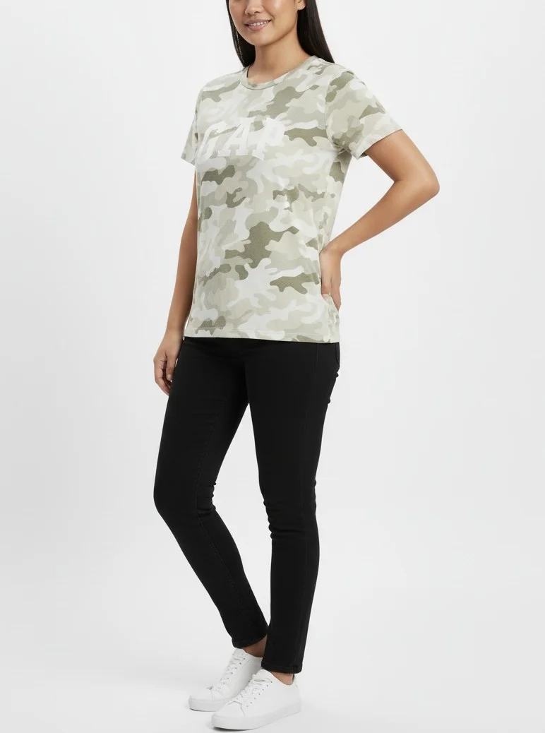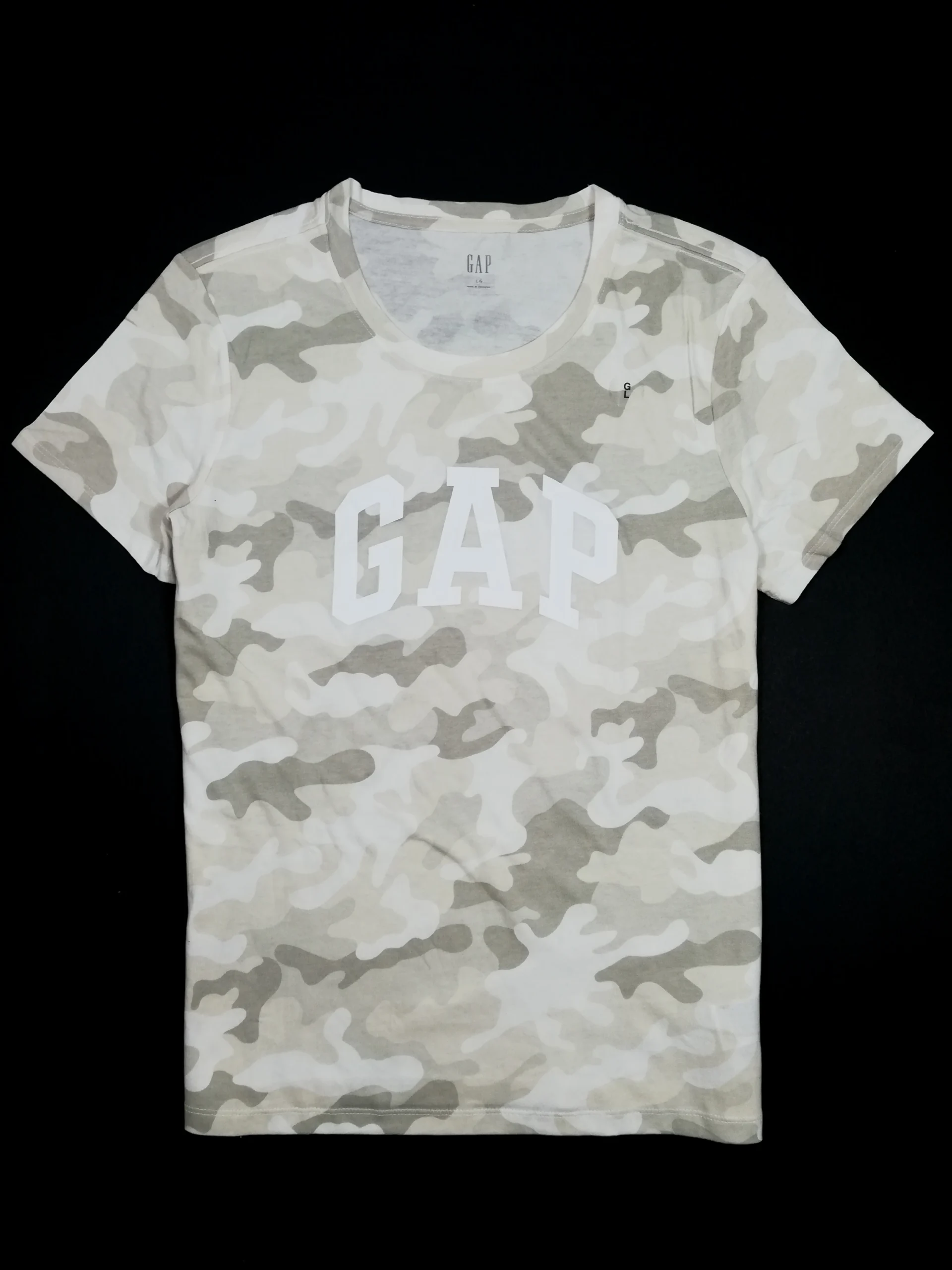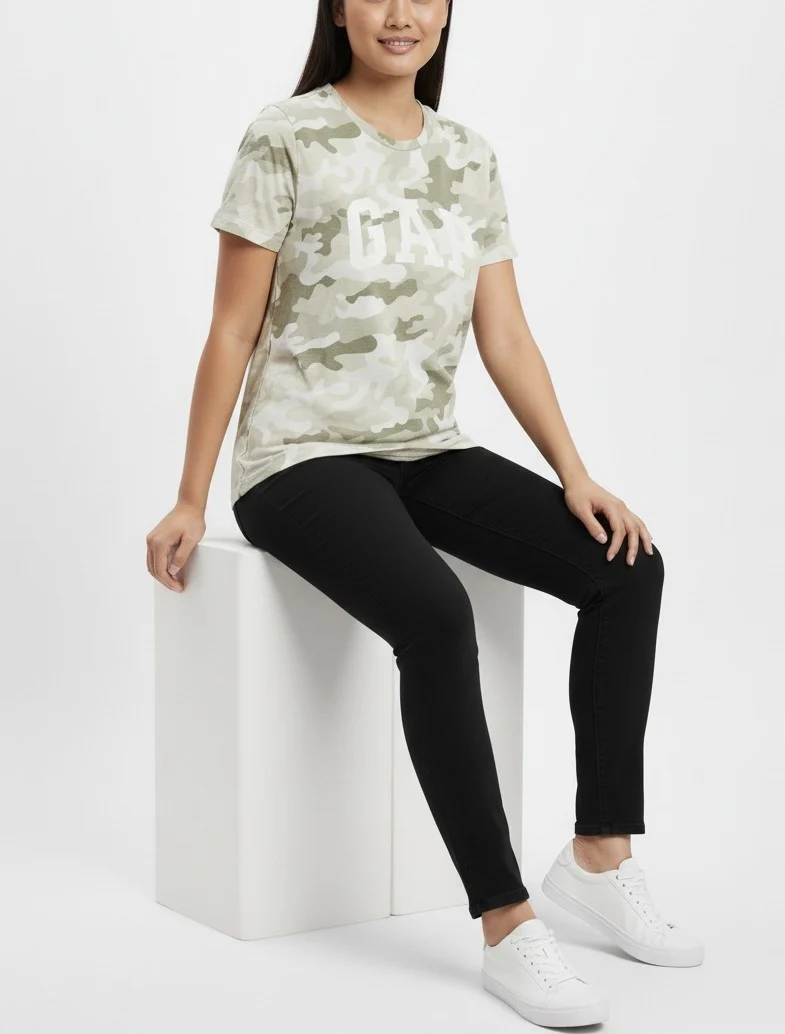 Make a bold yet effortless statement with this GAP Women’s Camo Army Logo T-Shirt in size Large. Designed with a classic crew neck and short sleeves, this tee showcases a modern camouflage print in earthy tones, complemented by the iconic GAP logo front and center. Made from soft, breathable cotton, it offers everyday comfort with an edge.
