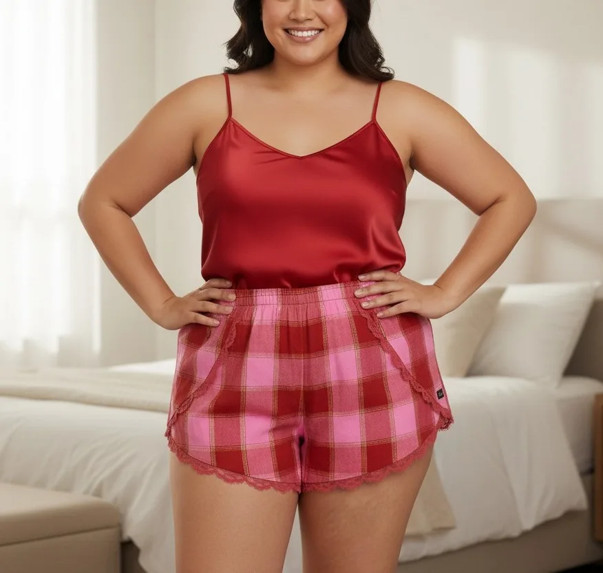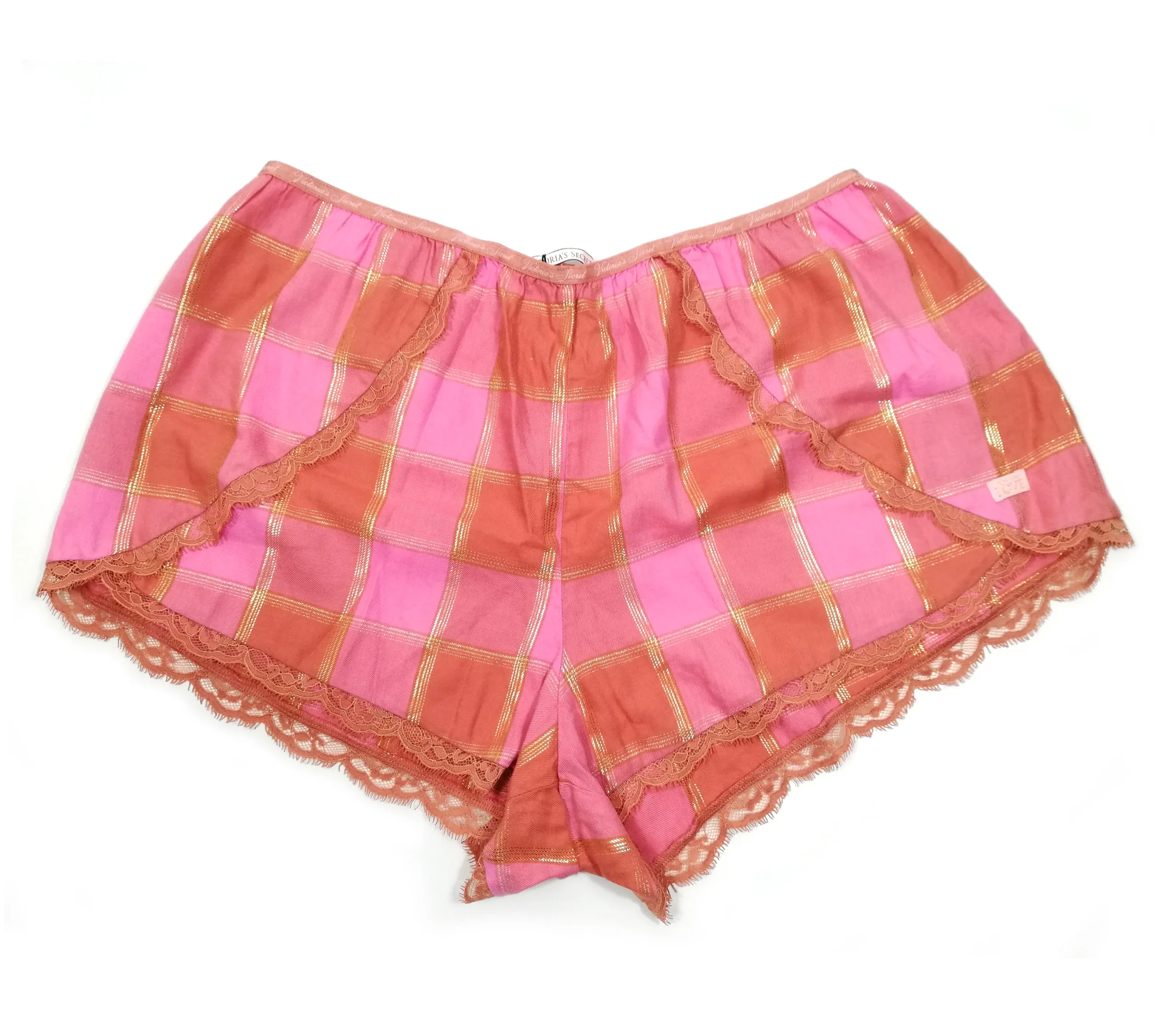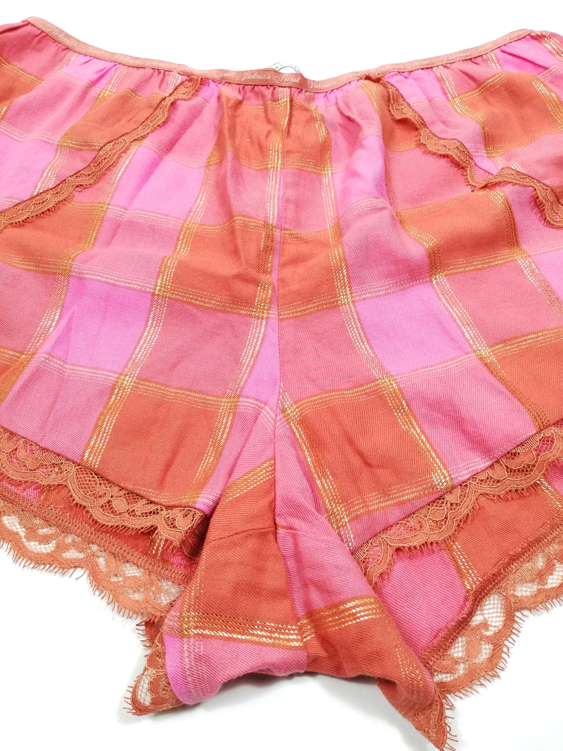 Unwind in comfort and style with the Victoria’s Secret Women’s Lace Plaid Sleep Shorts. Crafted from a soft fabric blend, these shorts boast a timeless red-and-pink plaid pattern with subtle gold detailing, adding a touch of sophistication to your sleepwear. The stretchy waistband ensures a comfortable fit, while the delicate lace trim at the hem provides a feminine flair.
